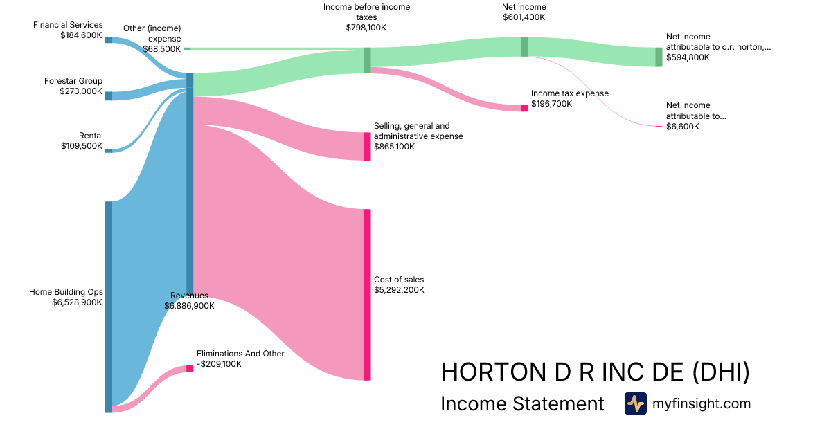 For the quarter ending 2025-12-31, DHI made $6,886,900K in revenue. $594,800K in net income. Net profit margin of 8.64%.