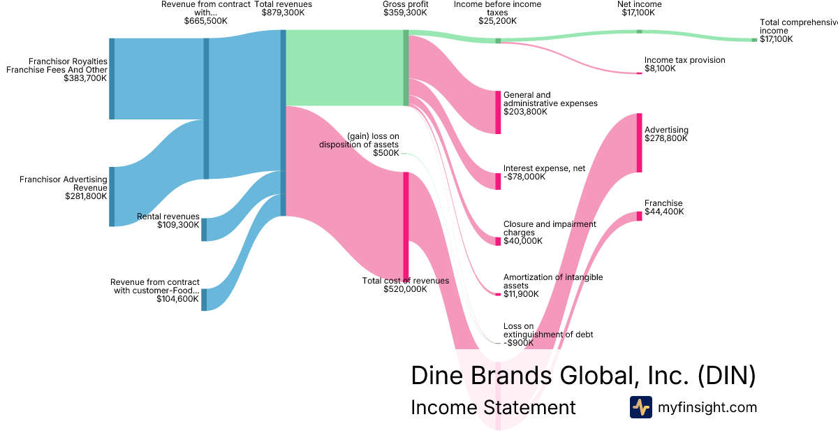 For the year ending 2025-12-28, DIN made $879,300K in revenue. $17,100K in net income. Net profit margin of 1.94%.