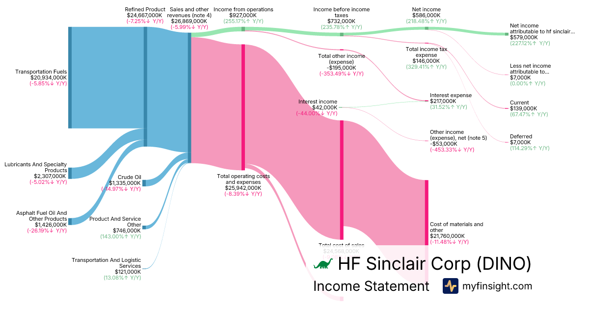 For the year ending 2025-12-31, DINO made $26,869,000K in revenue. $579,000K in net income. Net profit margin of 2.15%.