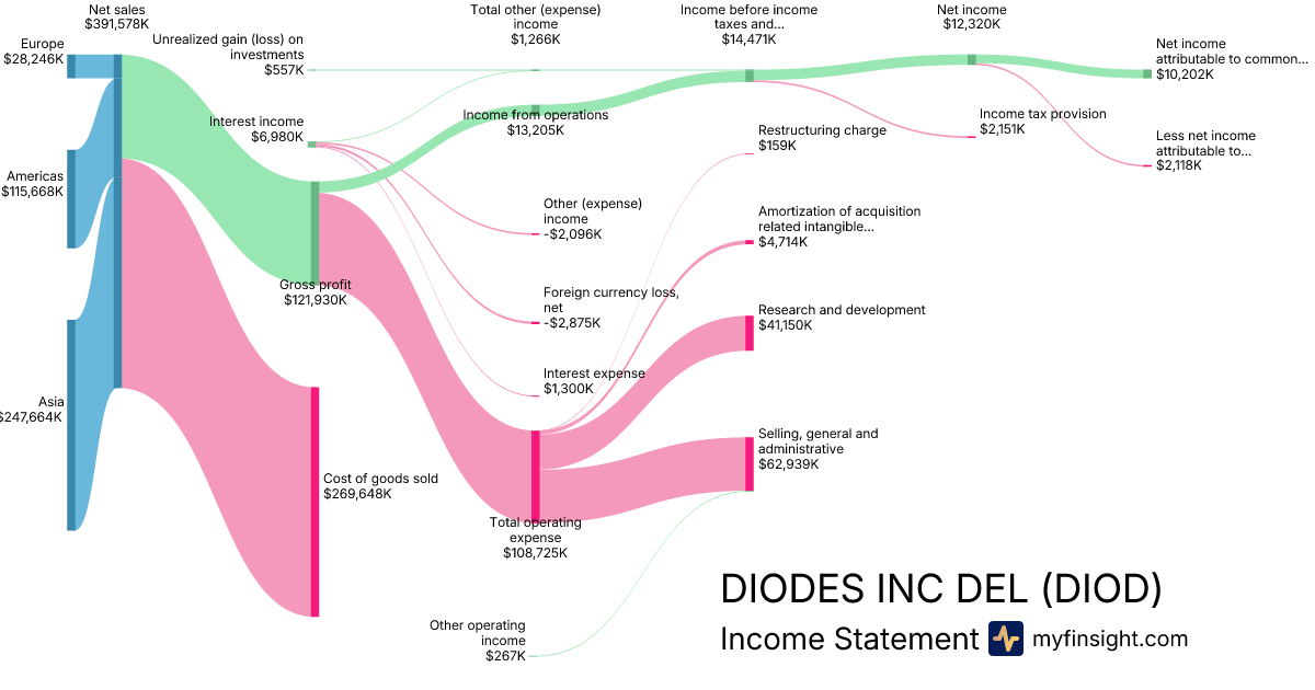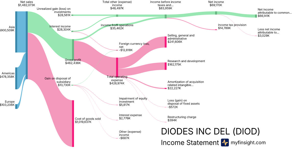 For the year ending 2025-12-31, DIOD made $1,482,073K in revenue. $66,141K in net income. Net profit margin of 4.46%.