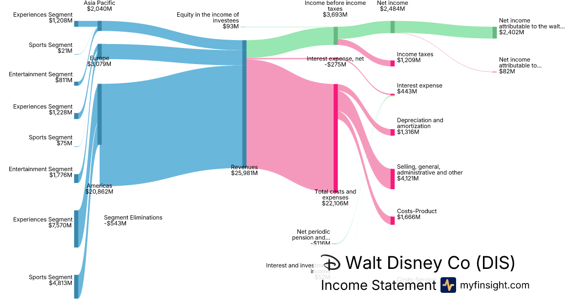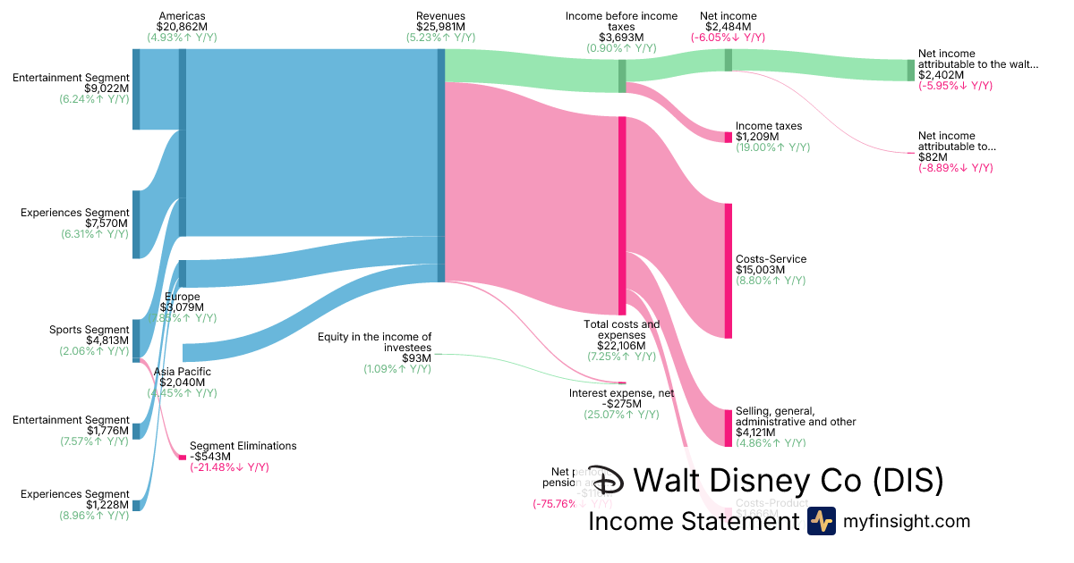 For the quarter ending 2025-12-27, DIS made $25,981M in revenue. $2,402M in net income. Net profit margin of 9.25%.