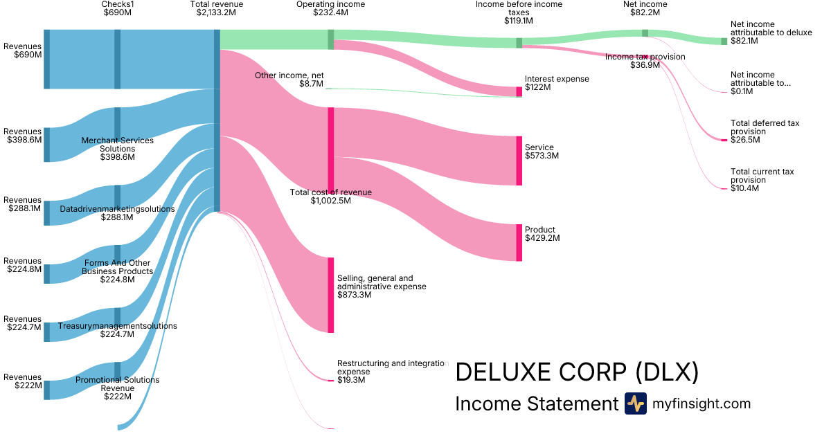 For the year ending 2025-12-31, DLX made $2,133.2M in revenue. $82.1M in net income. Net profit margin of 3.85%.