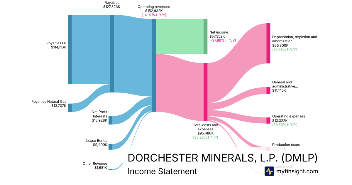 For the year ending 2025-12-31, DMLP made $152,832K in revenue. $57,352K in net income. Net profit margin of 37.53%.