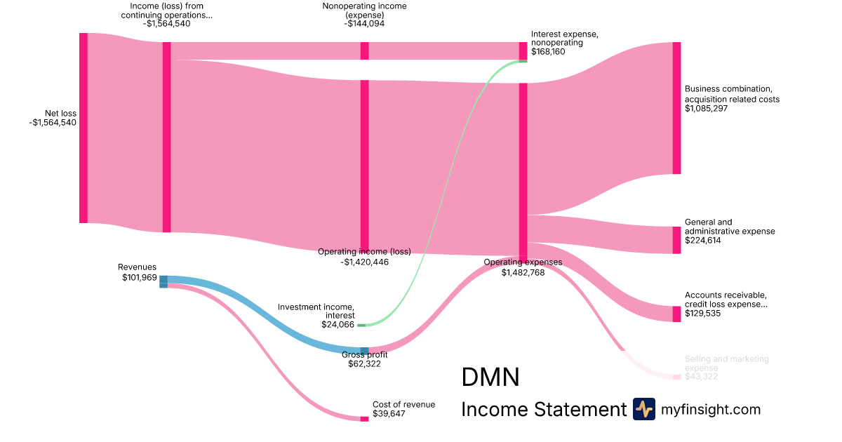 For the quarter ending 2024-09-30, DMN made $101,969 in revenue. -$1,564,540 in net income. Net profit margin of -1534.33%.