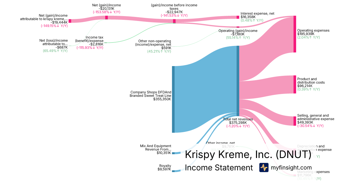 For the quarter ending 2025-09-28, DNUT made $375,298K in revenue. -$19,444K in net income. Net profit margin of -5.18%.