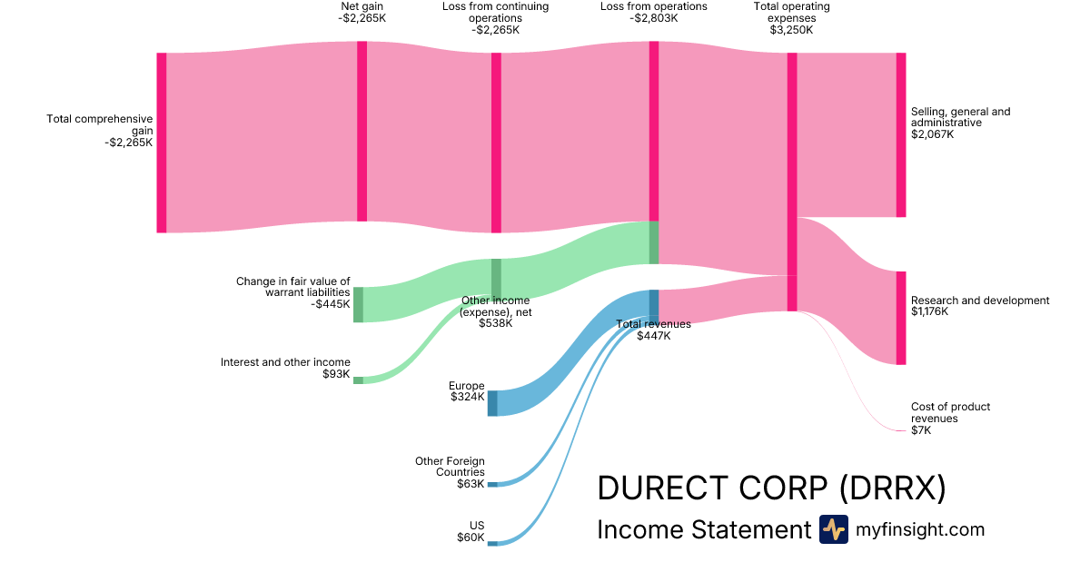 For the quarter ending 2025-06-30, DRRX made $447K in revenue. -$2,265K in net income. Net profit margin of -506.71%.