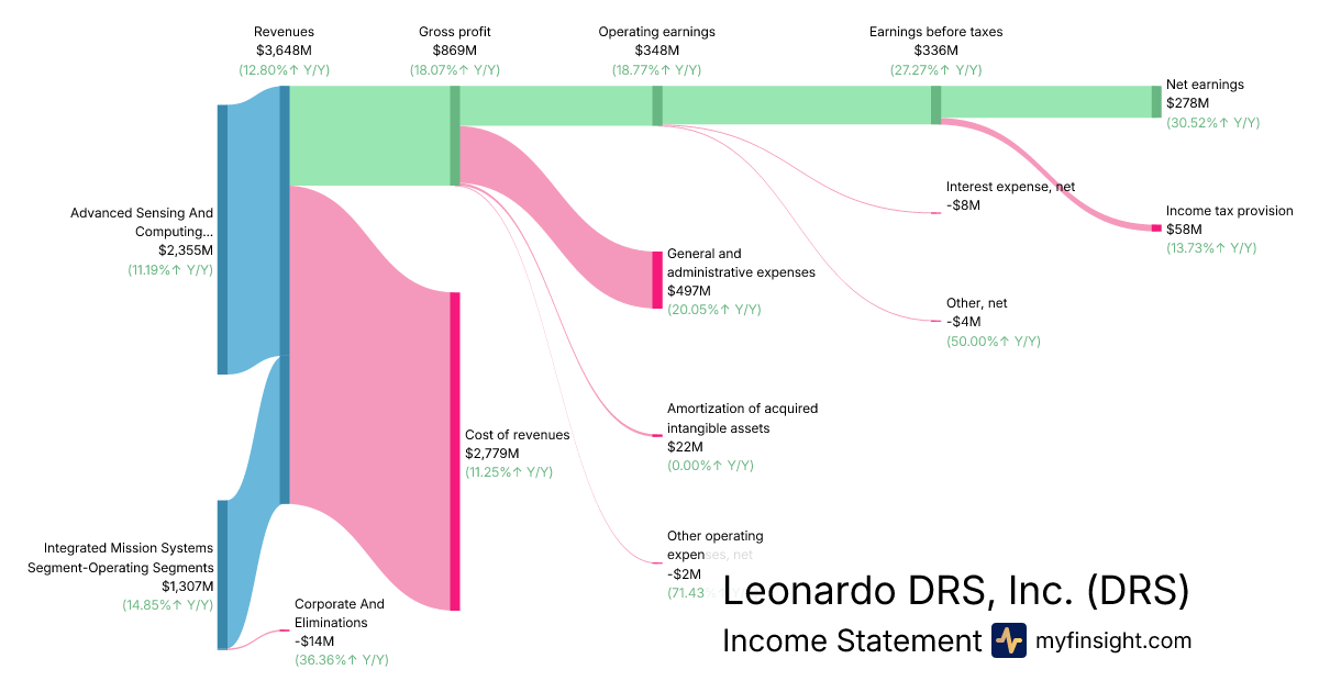 For the year ending 2025-12-31, DRS made $3,648M in revenue. $278M in net income. Net profit margin of 7.62%.