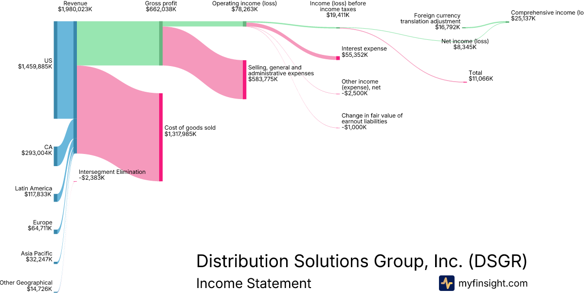 For the year ending 2025-12-31, DSGR made $1,980,023K in revenue. $25,137K in net income. Net profit margin of 1.27%.