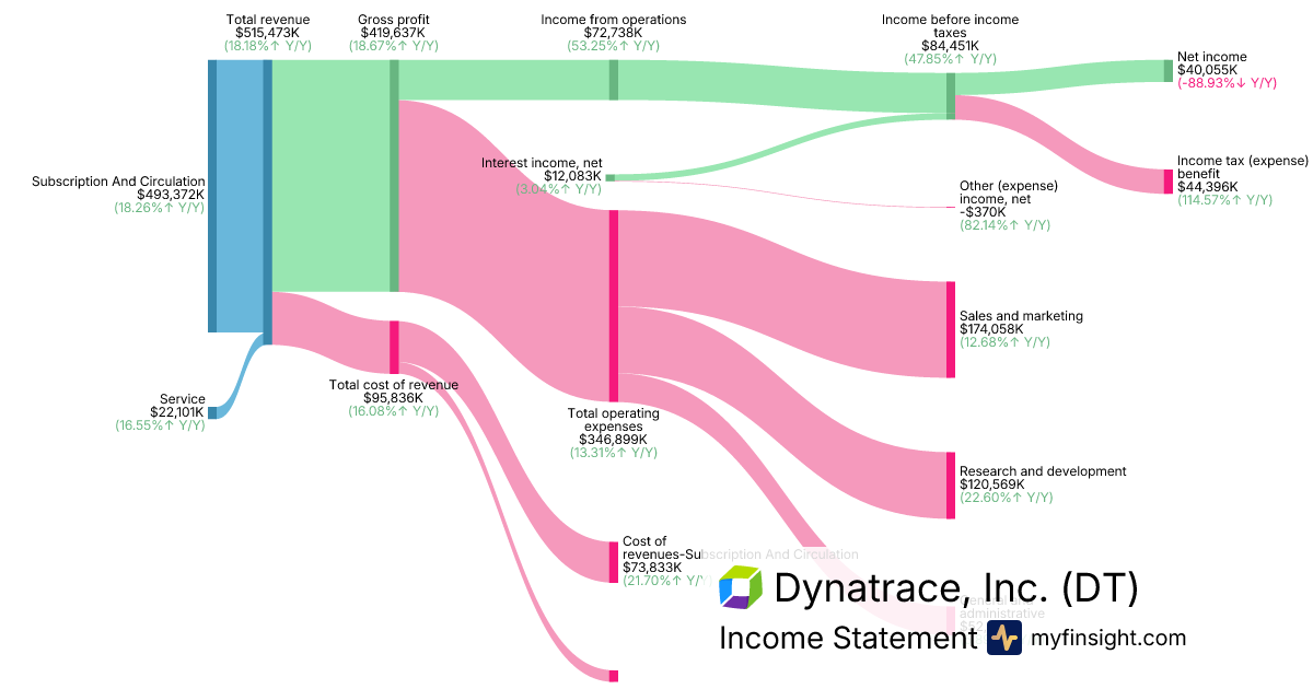 For the quarter ending 2025-12-31, DT made $515,473K in revenue. $40,055K in net income. Net profit margin of 7.77%.