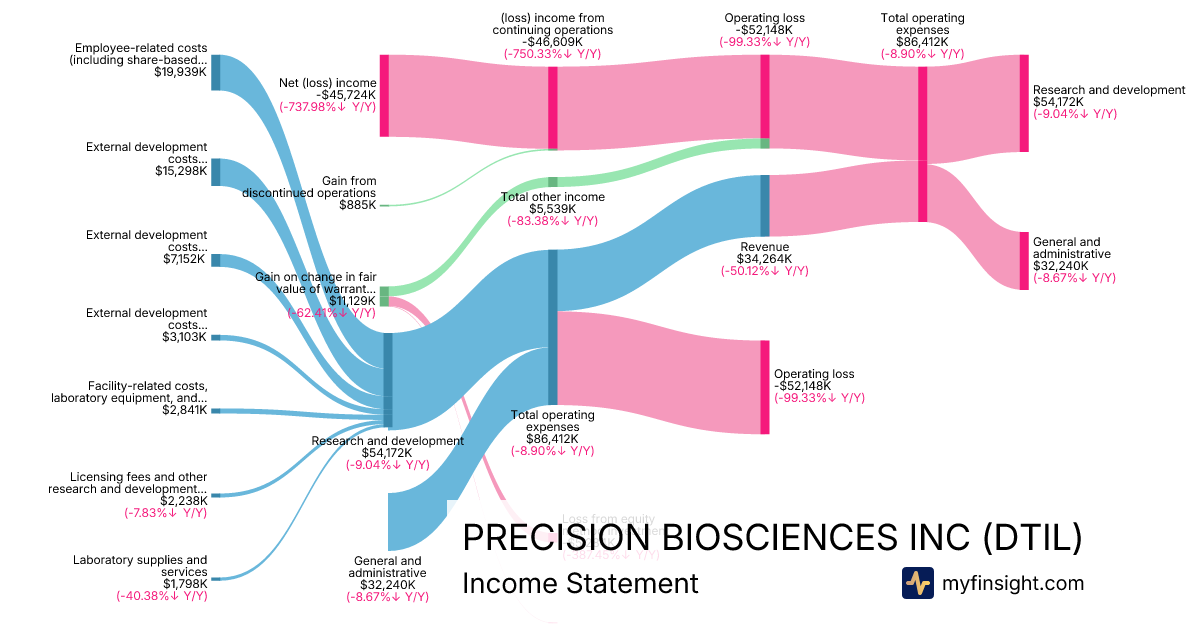 For the year ending 2025-12-31, DTIL made $34,264K in revenue. -$45,724K in net income. Net profit margin of -133.45%.
