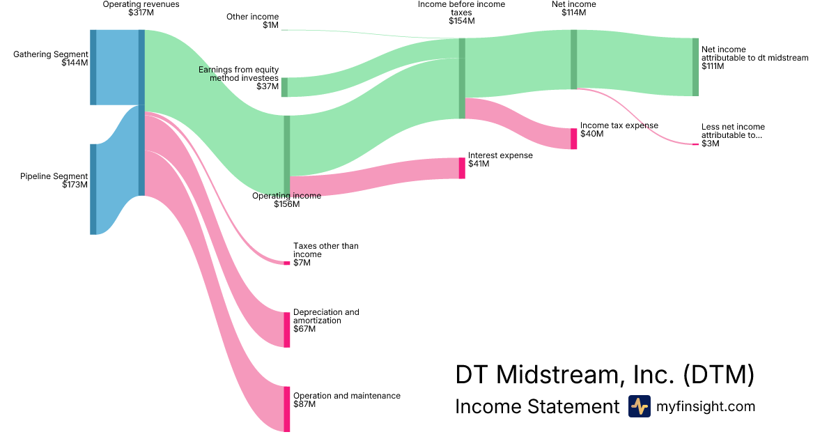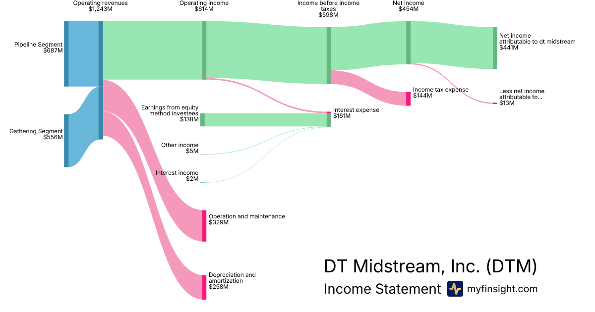 For the year ending 2025-12-31, DTM made $1,243M in revenue. $441M in net income. Net profit margin of 35.48%.