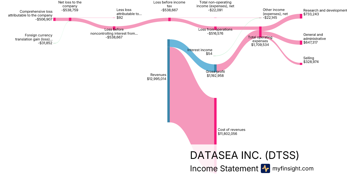 For the quarter ending 2025-12-31, DTSS made $12,995,014 in revenue. -$506,907 in net income. Net profit margin of -3.90%.