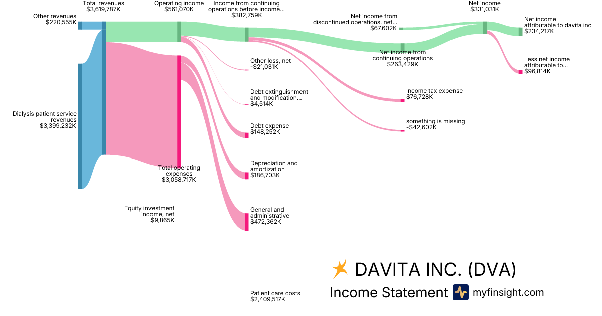 For the year ending 2025-12-31, DVA made $13,643,069K in revenue. $746,803K in net income. Net profit margin of 5.47%.