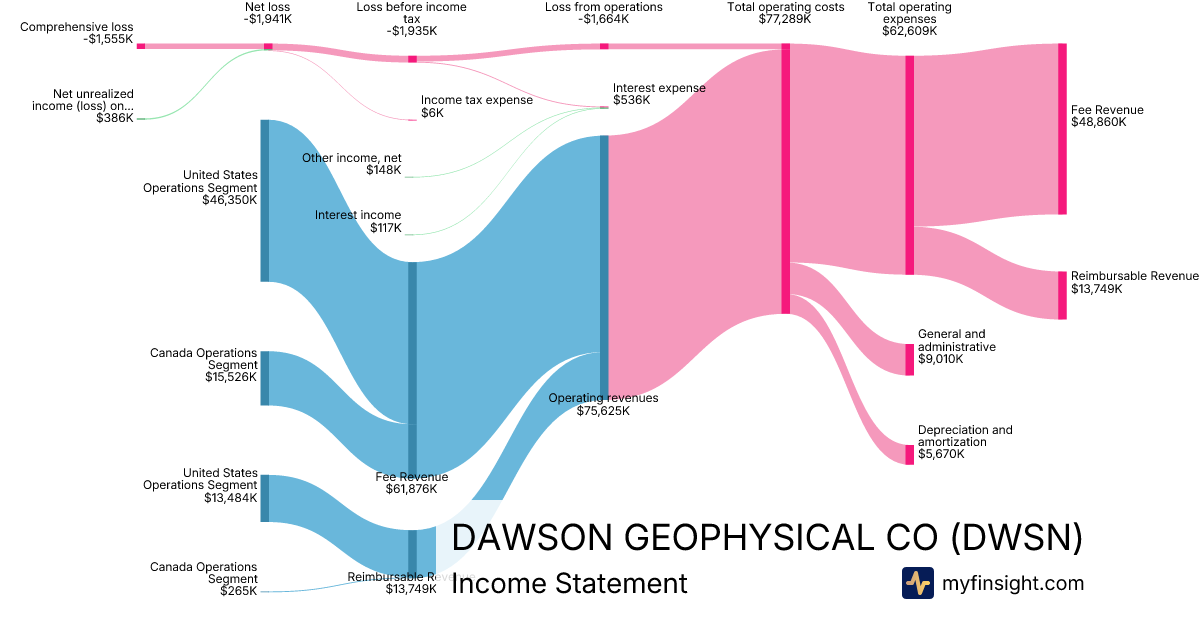 For the year ending 2025-12-31, DWSN made $75,625K in revenue. -$1,555K in net income. Net profit margin of -2.06%.