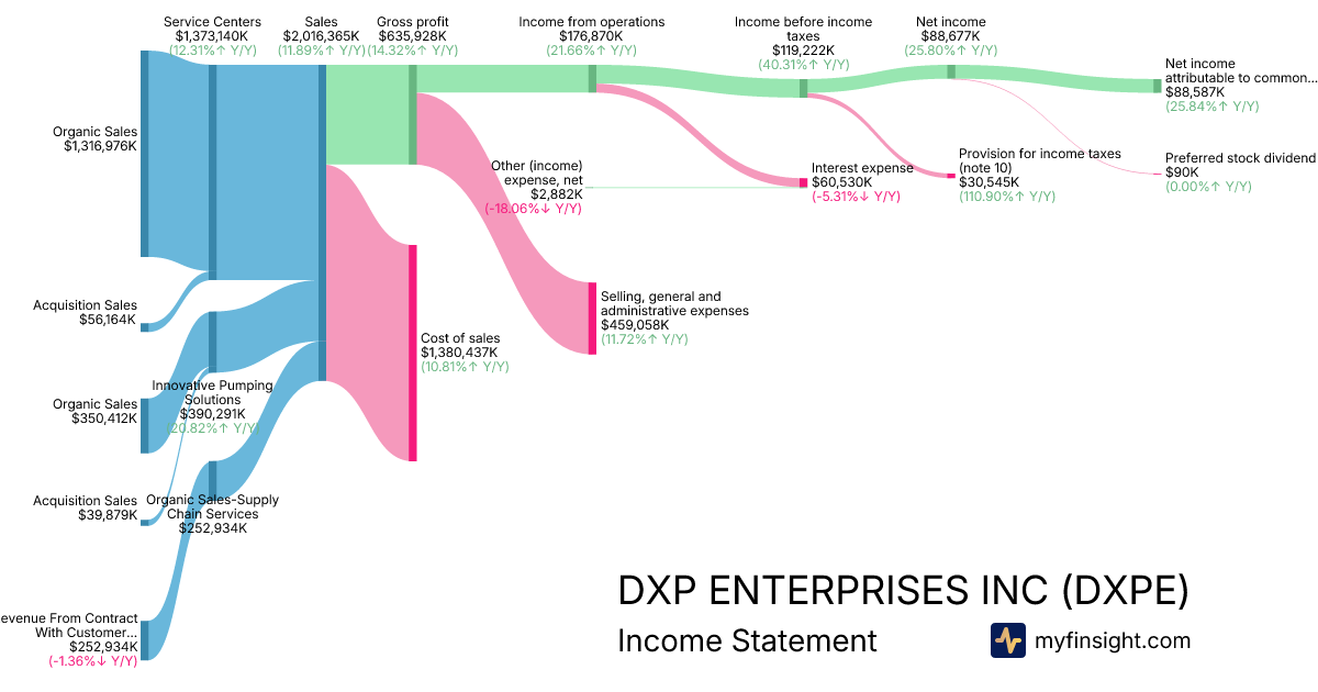 For the year ending 2025-12-31, DXPE made $2,016,365K in revenue. $88,587K in net income. Net profit margin of 4.39%.