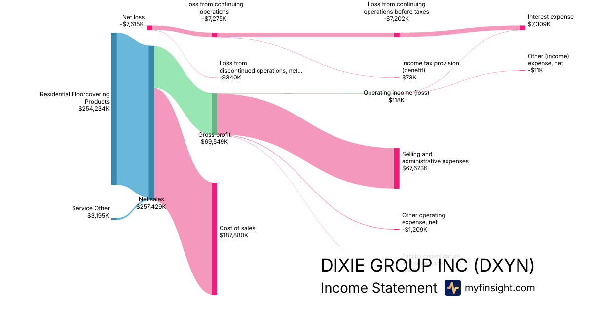 For the year ending 2025-12-27, DXYN made $257,429K in revenue. -$7,615K in net income. Net profit margin of -2.96%.
