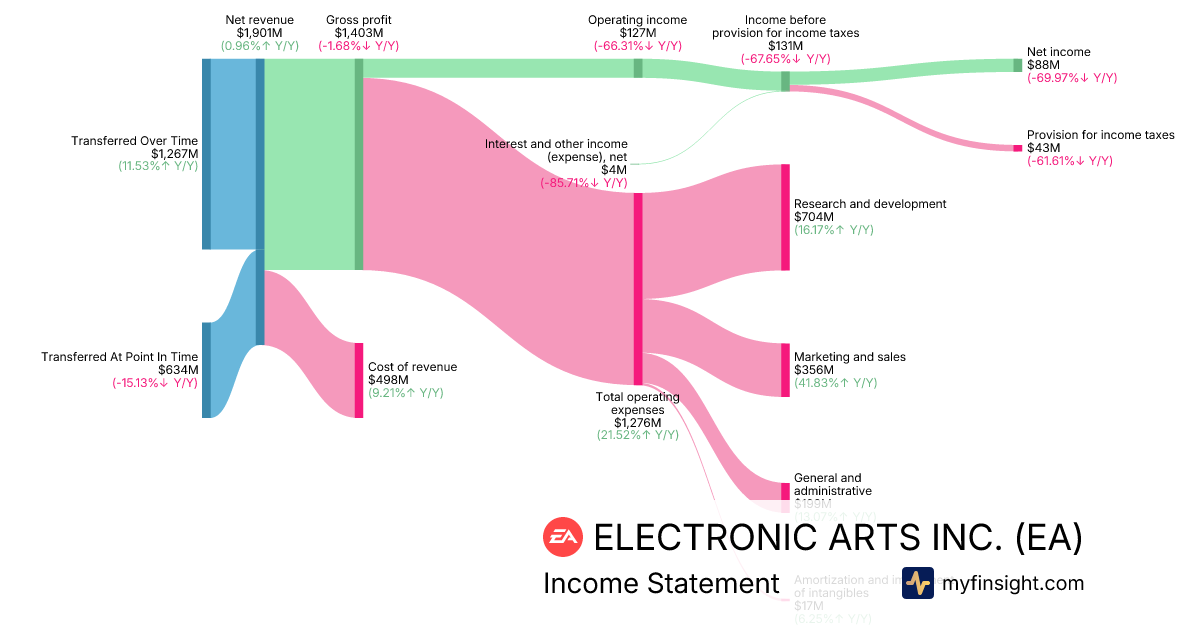 For the quarter ending 2025-12-31, EA made $1,901M in revenue. $88M in net income. Net profit margin of 4.63%.