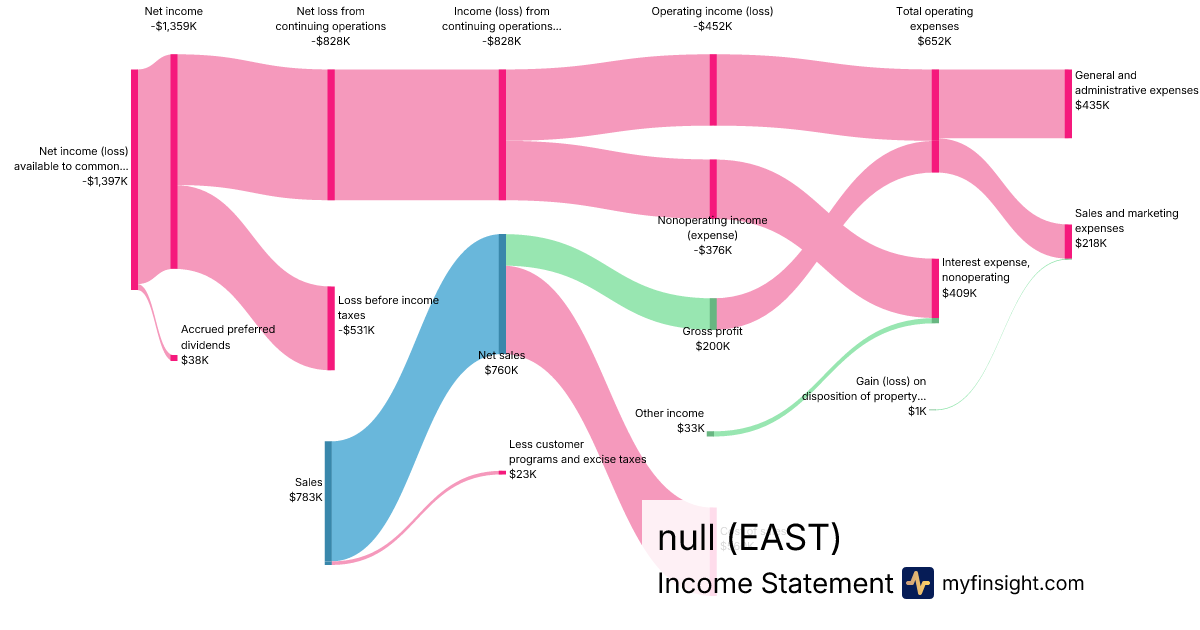 For the quarter ending 2024-09-30, EAST made $783K in revenue. -$1,397K in net income. Net profit margin of -178.42%.