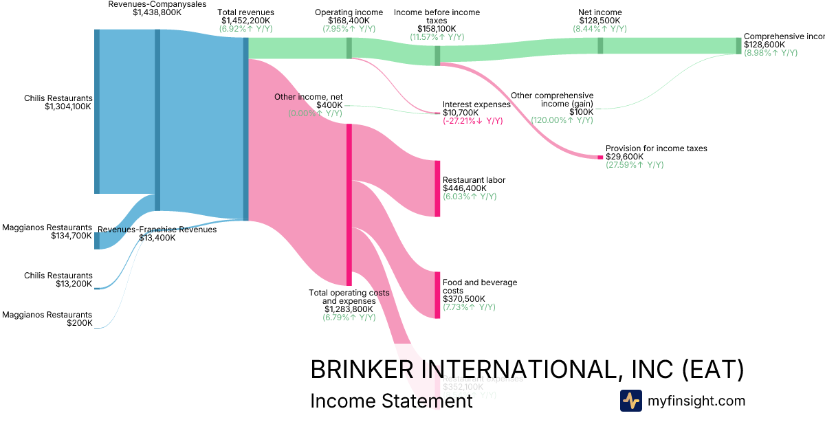 For the quarter ending 2025-12-24, EAT made $1,452,200K in revenue. $128,600K in net income. Net profit margin of 8.86%.