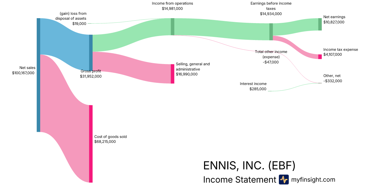 For the quarter ending 2025-11-30, EBF made $100,167,000 in revenue. $10,827,000 in net income. Net profit margin of 10.81%.