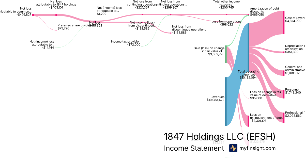 For the quarter ending 2025-03-31, EFSH made $23,903,501 in revenue. -$476,827 in net income. Net profit margin of -1.99%.