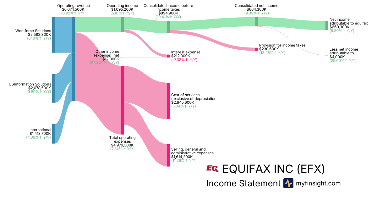 For the year ending 2025-12-31, EFX made $6,074,500K in revenue. $660,300K in net income. Net profit margin of 10.87%.