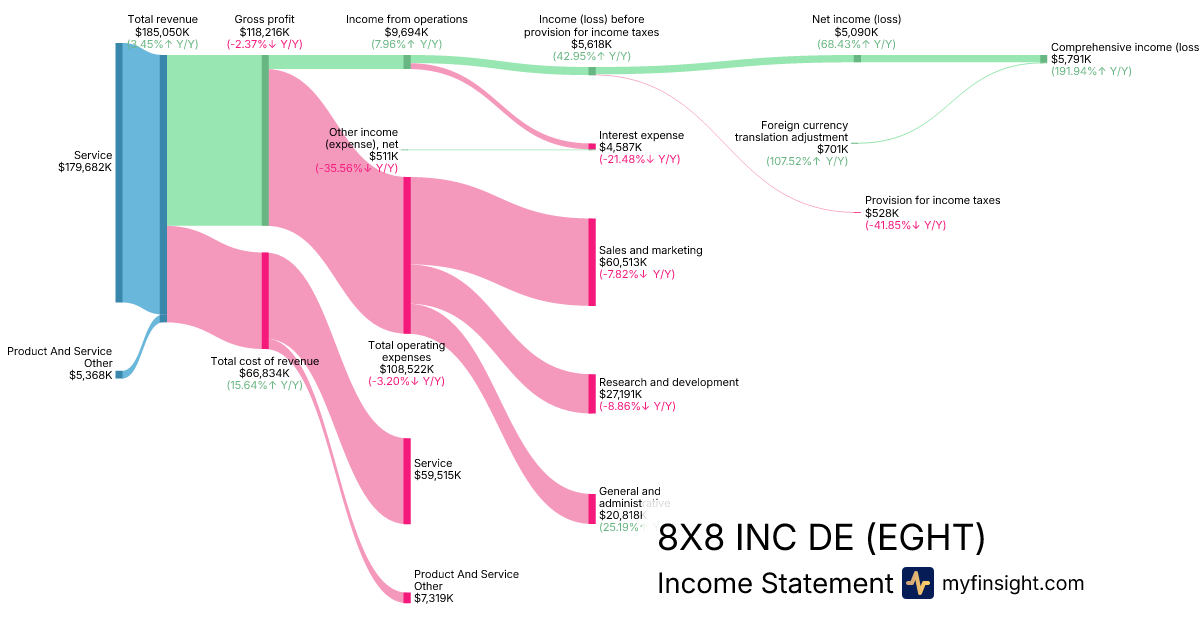 For the quarter ending 2025-12-31, EGHT made $185,050K in revenue. $5,791K in net income. Net profit margin of 3.13%.