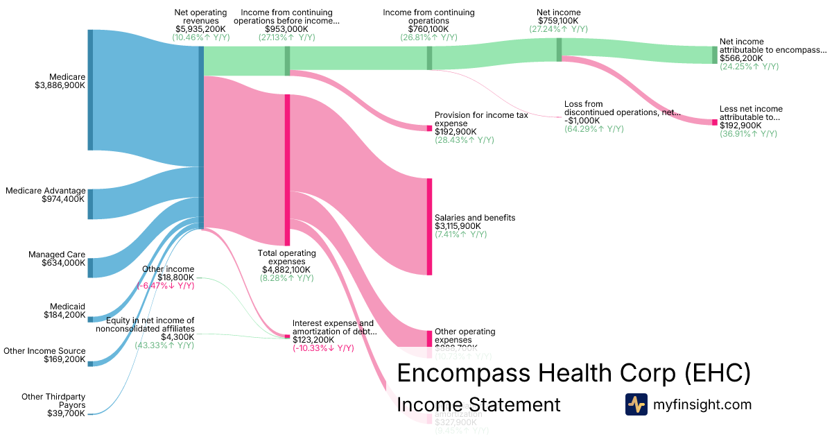 For the year ending 2025-12-31, EHC made $5,935,200K in revenue. $566,200K in net income. Net profit margin of 9.54%.