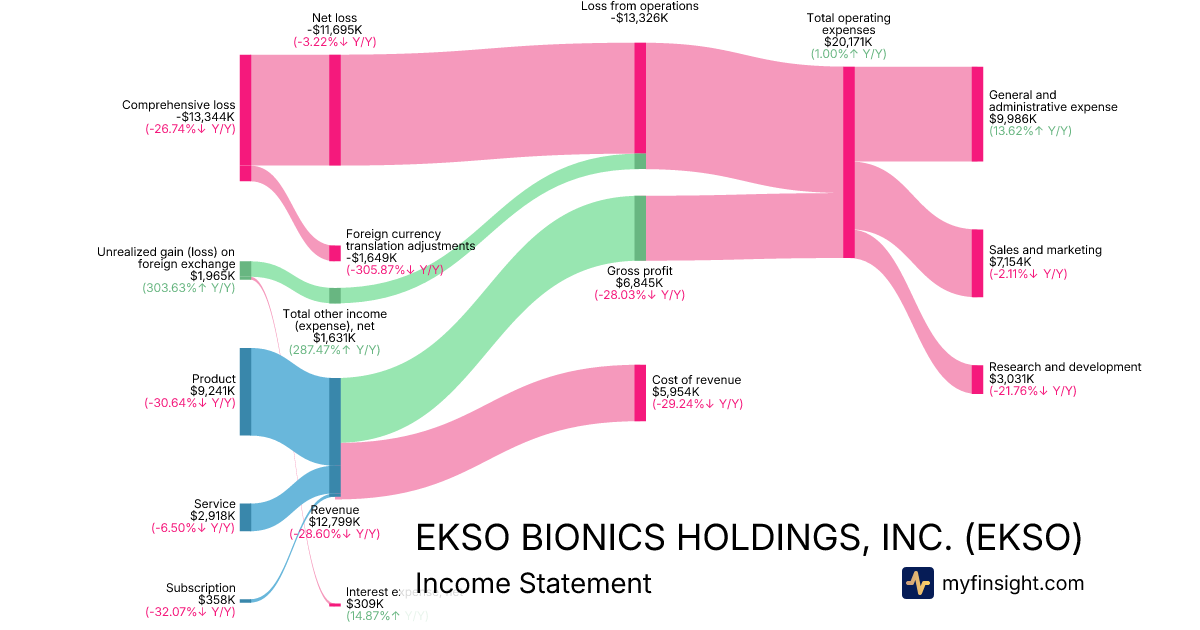 For the year ending 2025-12-31, EKSO made $12,799K in revenue. -$13,344K in net income. Net profit margin of -104.26%.