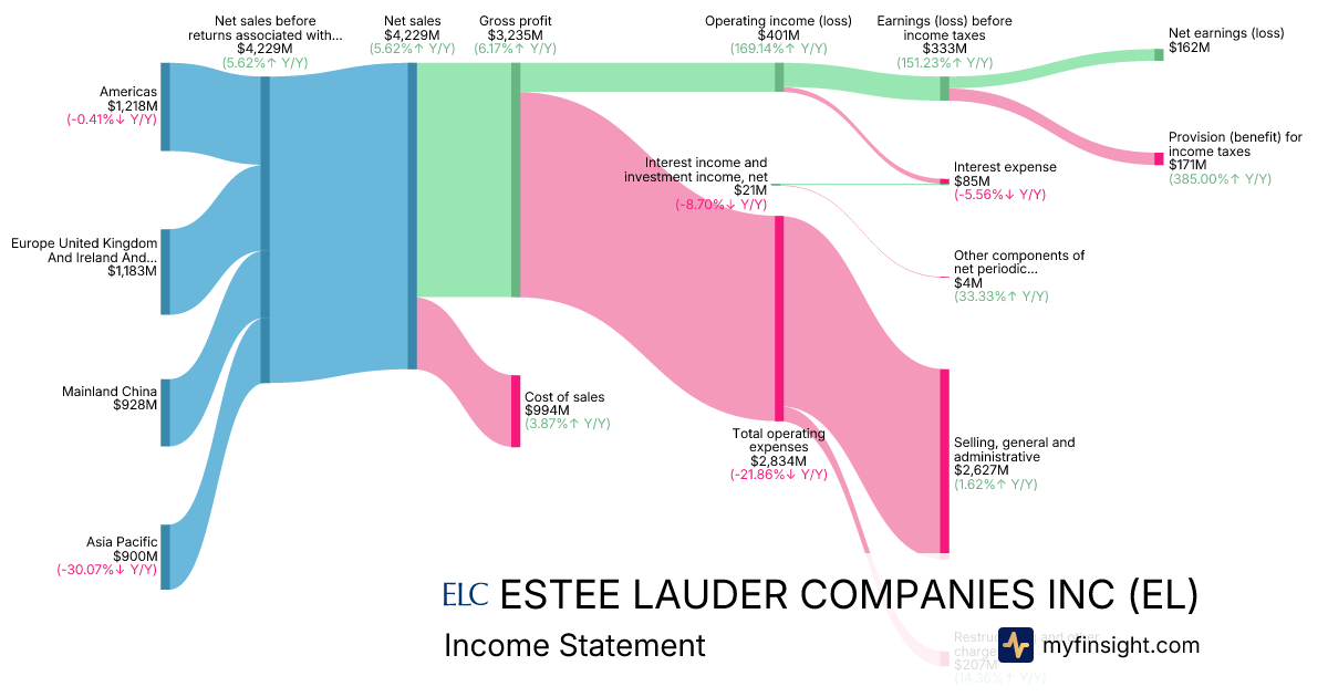 For the quarter ending 2025-12-31, EL made $4,229M in revenue. $162M in net income. Net profit margin of 3.83%.