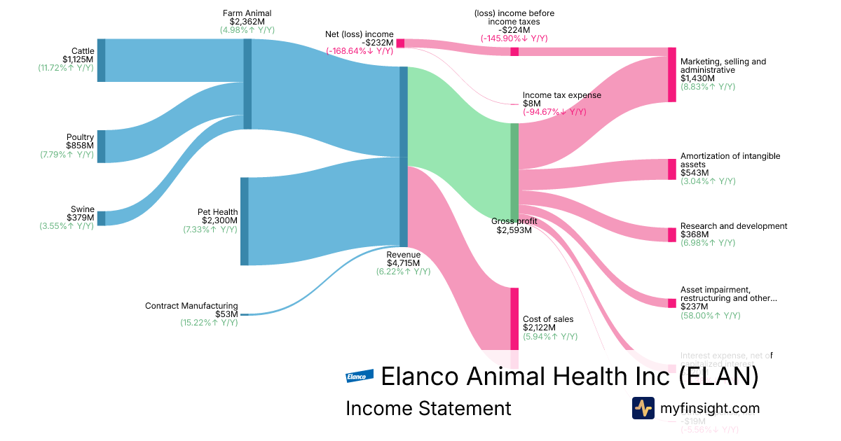 For the year ending 2025-12-31, ELAN made $4,715M in revenue. -$232M in net income. Net profit margin of -4.92%.