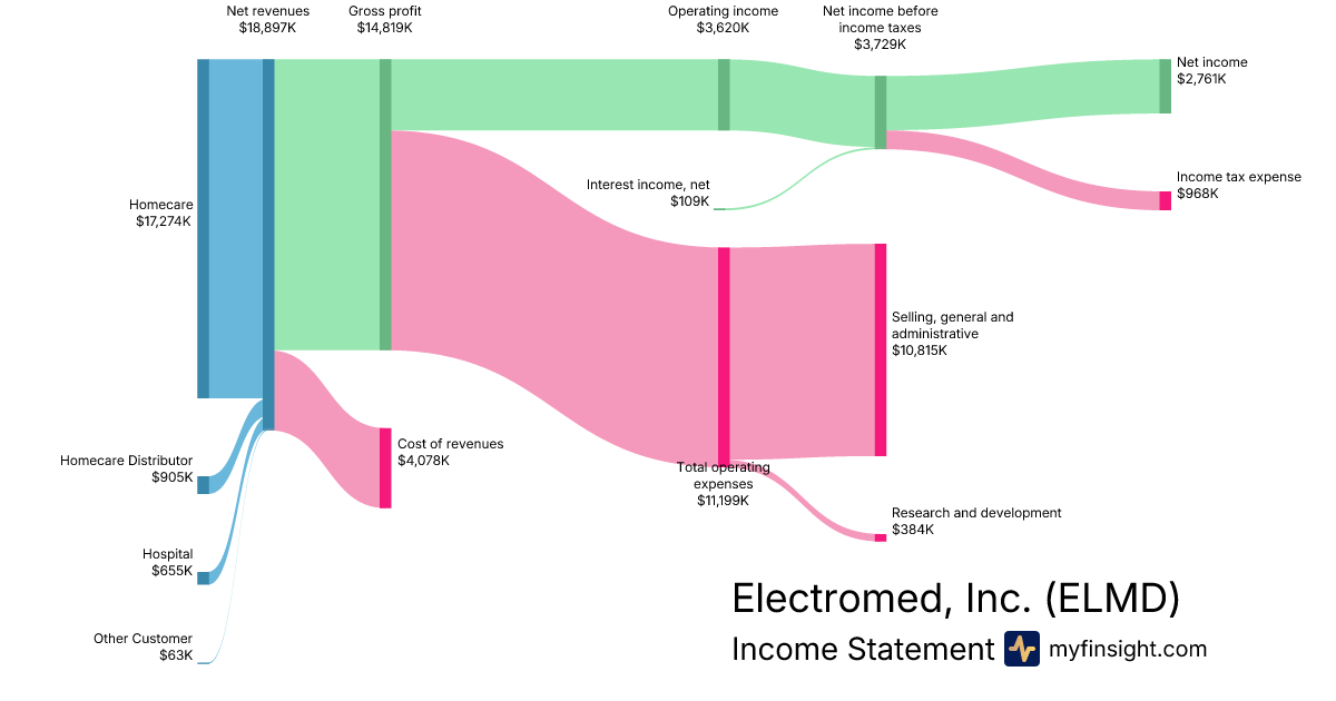 For the quarter ending 2025-12-31, ELMD made $18,897K in revenue. $2,761K in net income. Net profit margin of 14.61%.