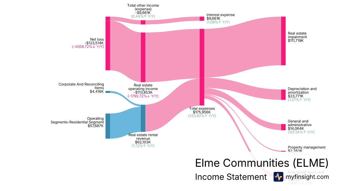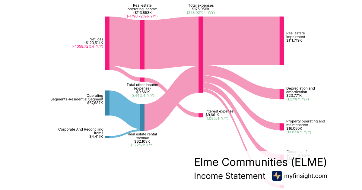 For the quarter ending 2025-09-30, ELME made $62,103K in revenue. -$123,514K in net income. Net profit margin of -198.89%.