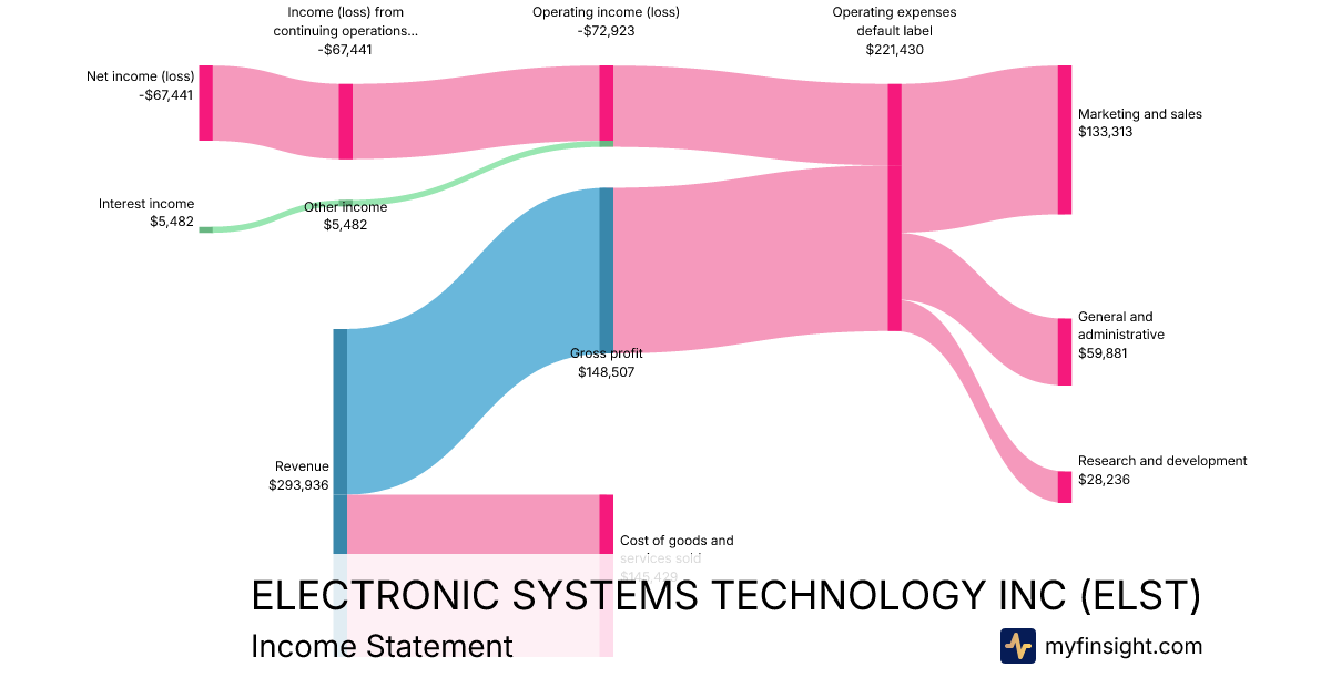 For the quarter ending 2024-09-30, ELST made $293,936 in revenue. -$67,441 in net income. Net profit margin of -22.94%.