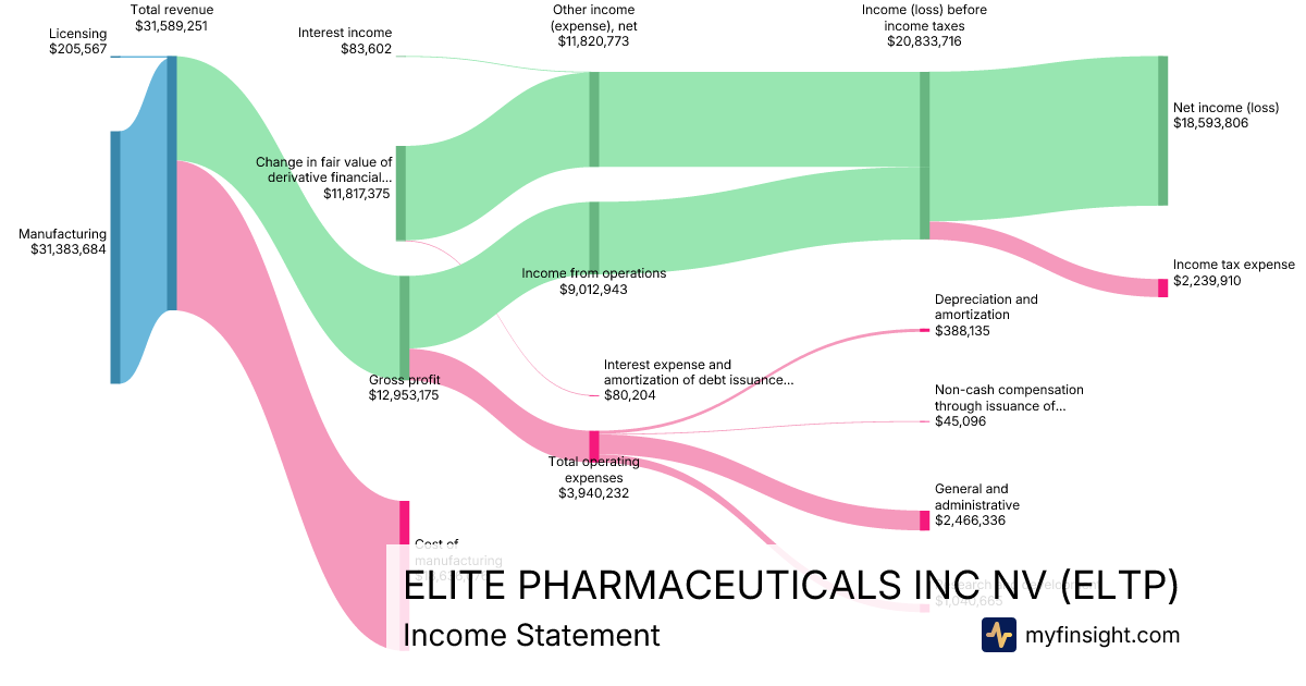For the quarter ending 2025-12-31, ELTP made $31,589,251 in revenue. $18,593,806 in net income. Net profit margin of 58.86%.