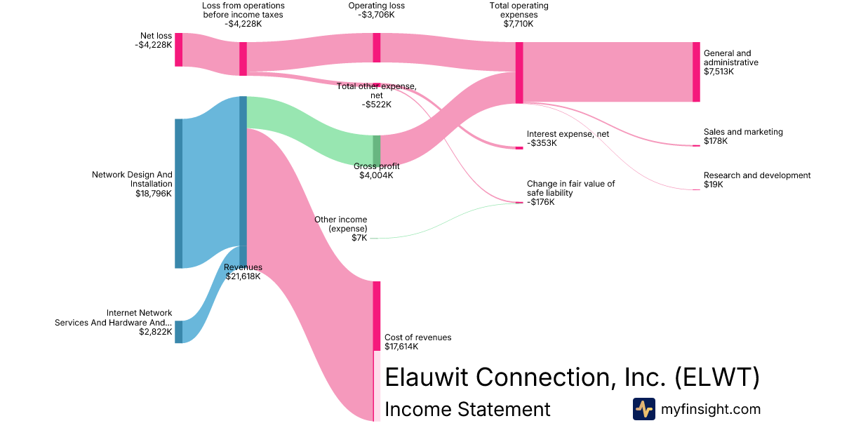 For the year ending 2025-12-31, ELWT made $21,618K in revenue. -$4,228K in net income. Net profit margin of -19.56%.