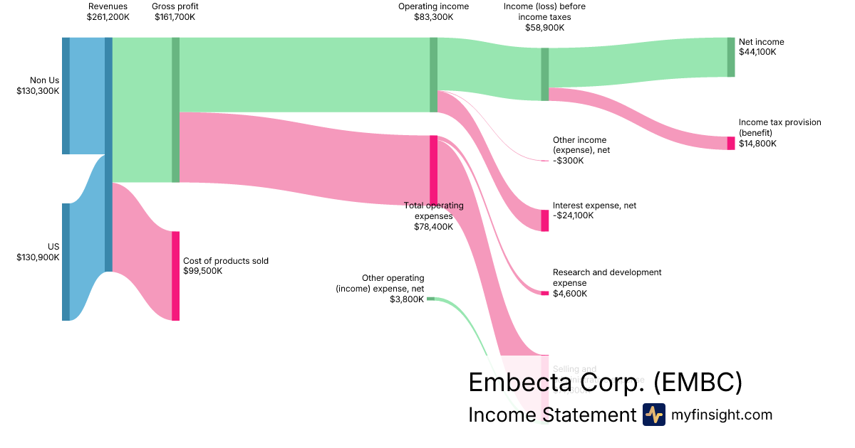 For the quarter ending 2025-12-31, EMBC made $343,400K in revenue. $44,100K in net income. Net profit margin of 12.84%.