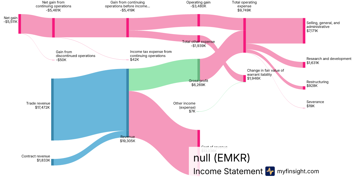 For the quarter ending 2024-12-31, EMKR made $19,305K in revenue. -$5,511K in net income. Net profit margin of -28.55%.