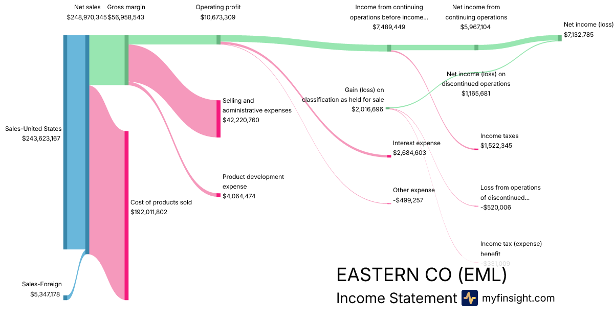 For the year ending 2026-01-03, EML made $248,970,345 in revenue. $7,132,785 in net income. Net profit margin of 2.86%.
