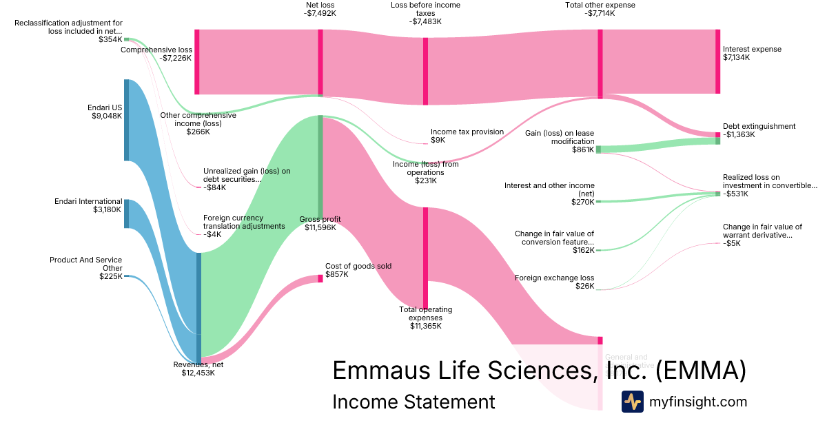 For the year ending 2025-12-31, EMMA made $12,453K in revenue. -$7,226K in net income. Net profit margin of -58.03%.