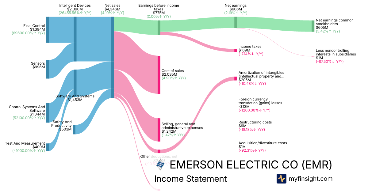 For the quarter ending 2025-12-31, EMR made $4,346M in revenue. $605M in net income. Net profit margin of 13.92%.
