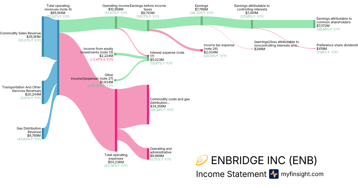 For the year ending 2025-12-31, ENB made $65,194M in revenue. $7,072M in net income. Net profit margin of 10.85%.