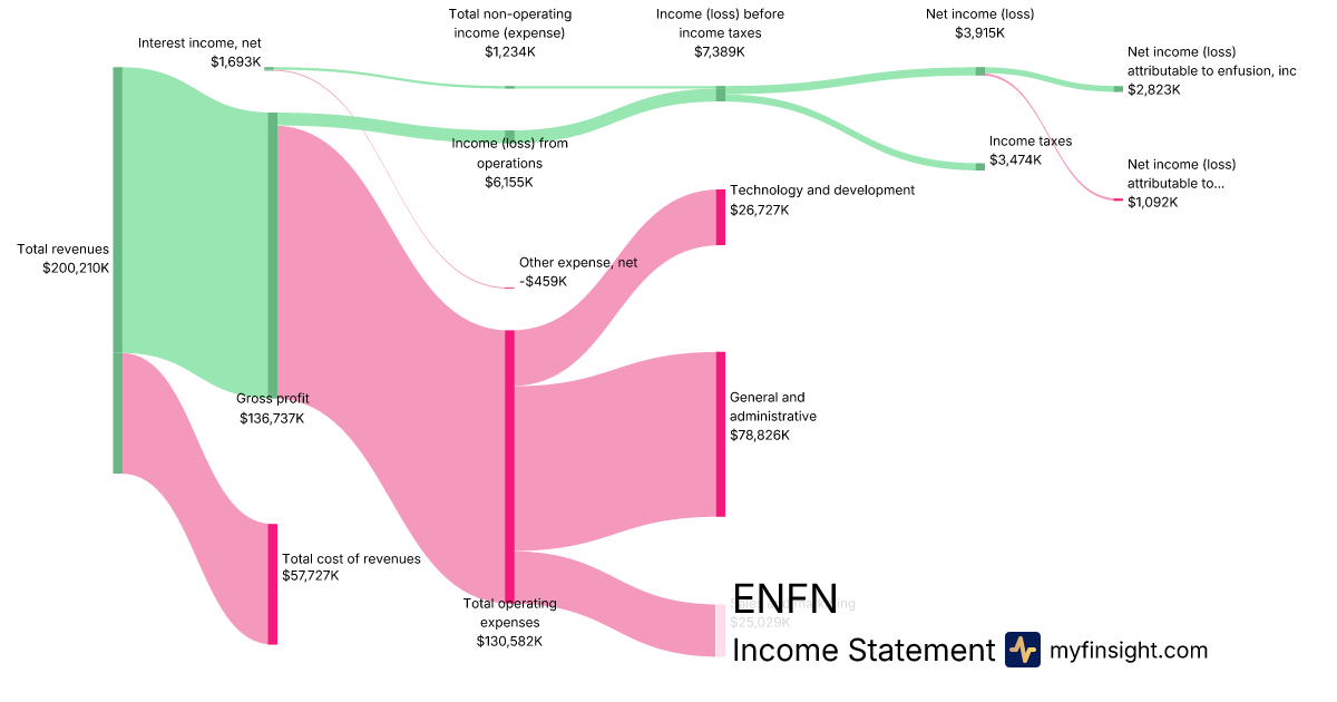 For the year ending 2024-12-31, ENFN made $332,485K in revenue. $2,823K in net income. Net profit margin of 0.85%.