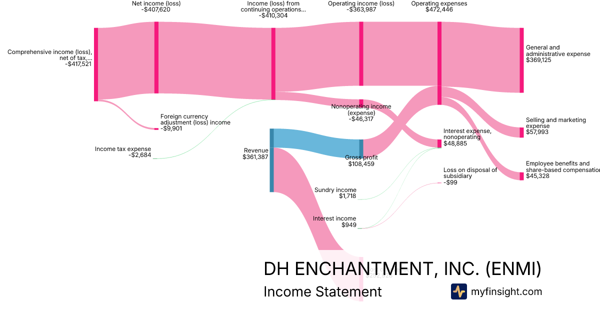 For the quarter ending 2024-09-30, ENMI made $361,387 in revenue. -$417,521 in net income. Net profit margin of -115.53%.