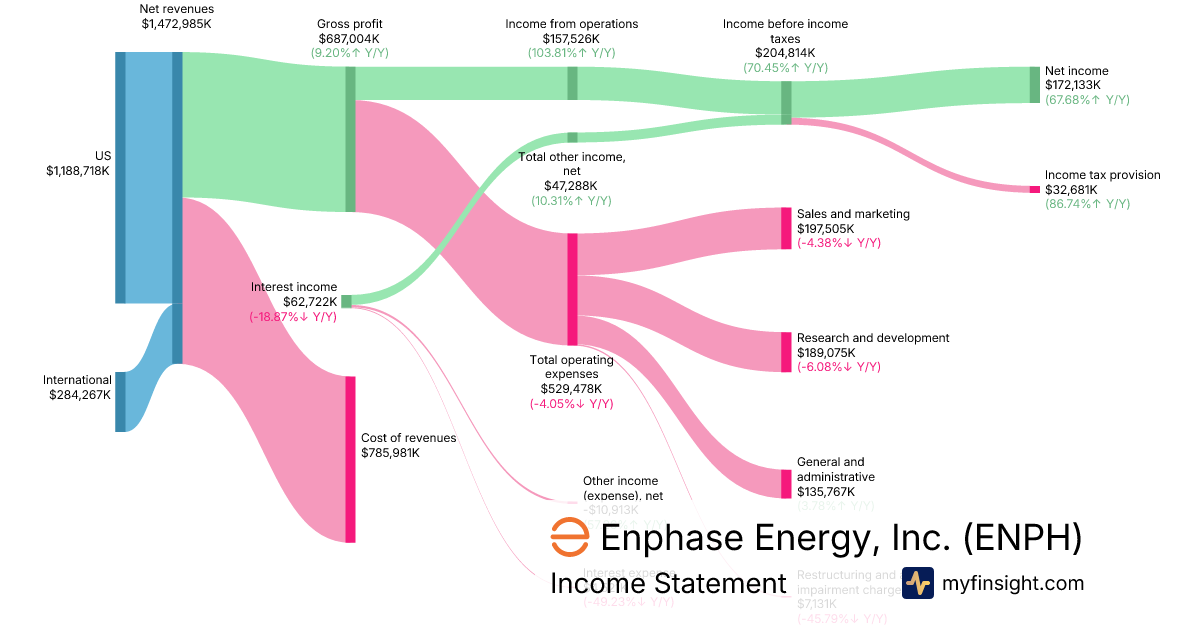 For the year ending 2025-12-31, ENPH made $1,472,985K in revenue. $172,133K in net income. Net profit margin of 11.69%.