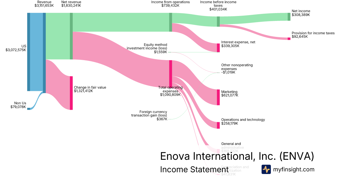 For the year ending 2025-12-31, ENVA made $3,151,653K in revenue. $308,389K in net income. Net profit margin of 9.78%.