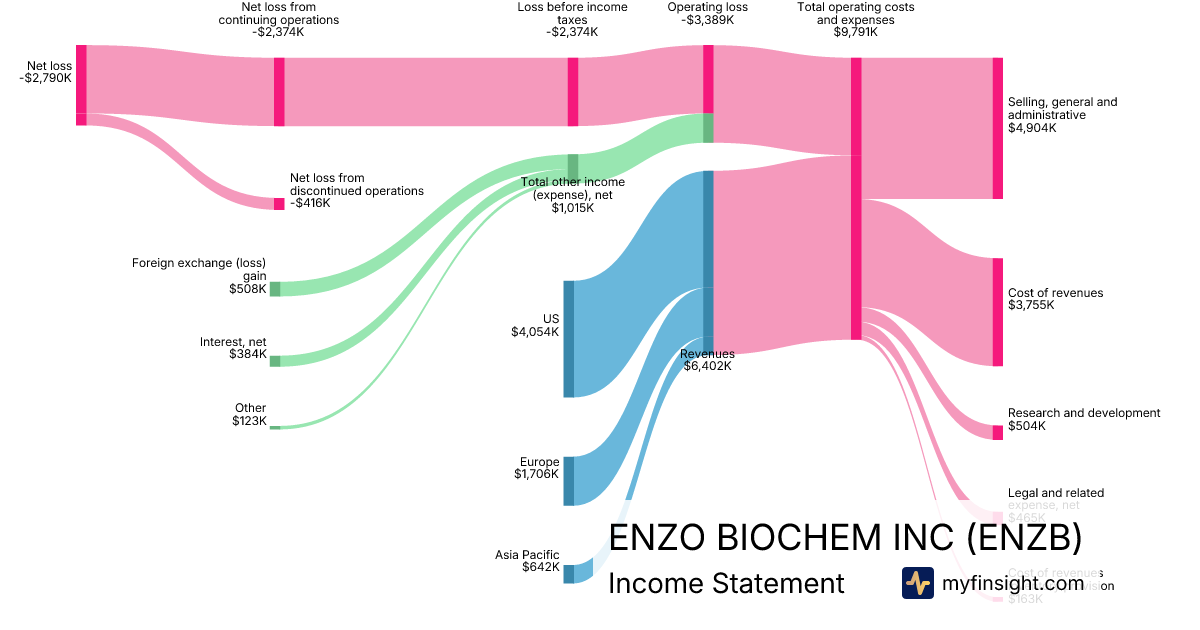 For the quarter ending 2025-04-30, ENZB made $6,402K in revenue. -$2,790K in net income. Net profit margin of -43.58%.