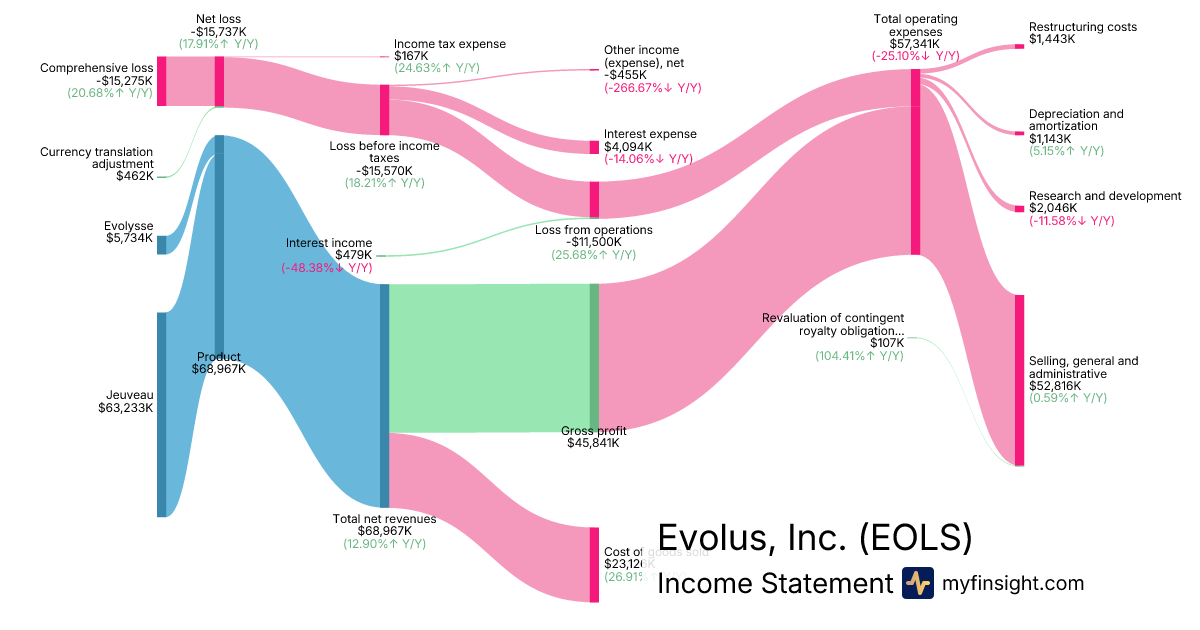For the quarter ending 2025-09-30, EOLS made $68,967,000 in revenue. -$15,275,000 in net income. Net profit margin of -22.15%.