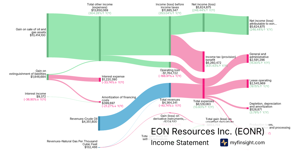 For the quarter ending 2025-09-30, EONR made $4,364,341 in revenue. $5,624,875 in net income. Net profit margin of 128.88%.