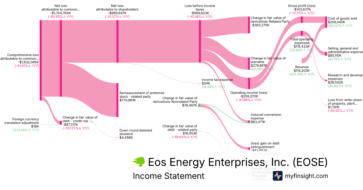 For the year ending 2025-12-31, EOSE made $114,203K in revenue. -$1,832,065K in net income. Net profit margin of -1604.22%.